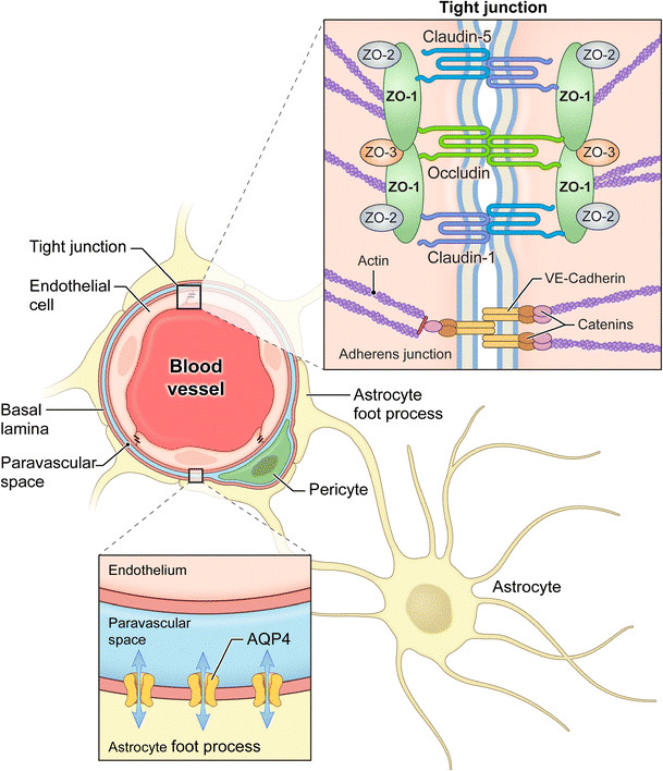 - Endothelial cells with tight junction proteins (claudin-5, occludin, ZO-1)