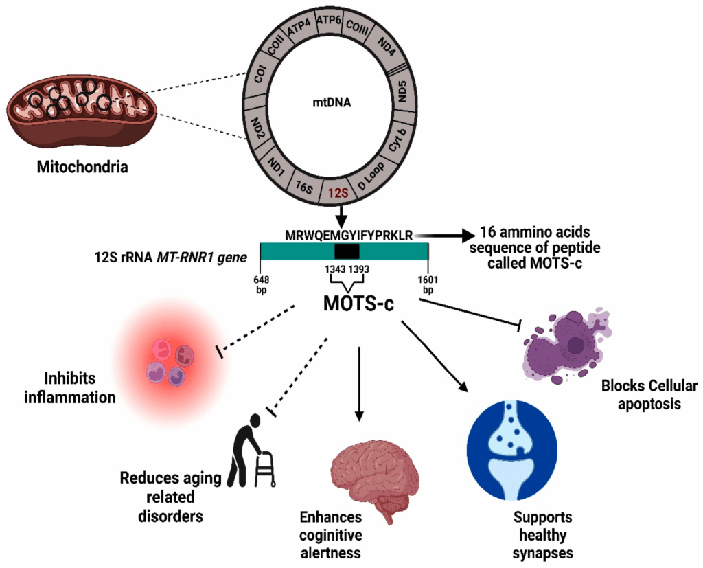 MOTS-C (Mitochondrial ORF of the 12S rRNA type-C) is one of the most intriguing peptide signals in current research because it is encoded in mitochondrial DNA itself. Unlike most proteins and peptides, which come from nuclear DNA, MOTS-C arises from the mitochondria’s own genome.